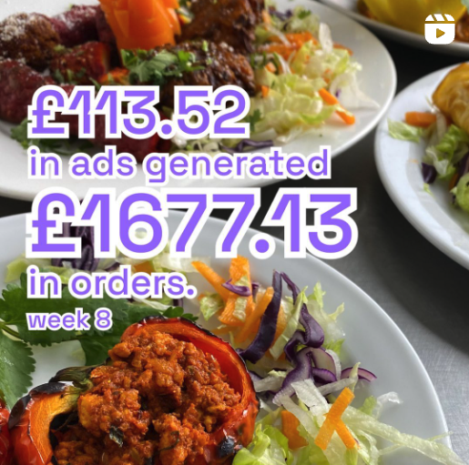This week we wanted to highlight that with the right campaign you can directly generate orders from your Meta ads in a short timeframe. £113.52 generated over £1677 in takeaway orders specifically from the advert, and on top of that we generated thousands more through other social posts, emails and whatsapps (just look back at some of our previous Just Leave videos to see the results).