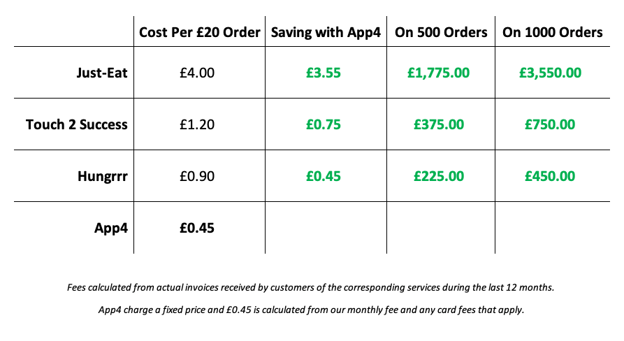 When considering other online ordering and App providers the cost per order can still be as much as £1.20 per order, which many don’t see as a total amount, as the companies tend to split it across monthly fees, order fees, card fees, processing fees and other ‘hidden charges’.